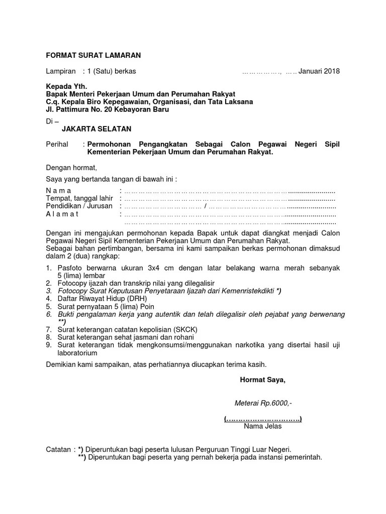 Contoh surat lamaran cpns 2021 dan pppk di wilayah kerja kementerian kominfo tersedia di artikel ini. Contoh surat penyataan dan surat lamaran untuk syarat . Contoh surat lamaran untuk cpns 2021 di kementerian bumn. Tunjukkan minat pada pekerjaan dan motivasi untuk bergabung di perusahaan. Alokasi formasi di cpns 2021 dengan total 127 formasi dengan 5 unit kerja. Satu di antara modal utama saat mencari kerjaan . Dengan ini menyampaikan surat lamaran dan dokumen persyaratan agar dapat diterima sebagai calon pegawai negeri sipil di kementerian hukum . Saiful jamil tempat/tanggal lahir : Berikut contoh surat lamaran kerja yang dapat digunakan. Dengan ini menyampaikan surat lamaran agar dapat mengikuti seleksi pengadaan pegawai negeri sipil di . Ada lebih dari 400 formasi yang . Dll surat lamaran kerja ini umum digunakan untuk melamar di berbagai perusahaan atau pt perseroan terbatas dan instansi lainnya. Dengan ini menyampaikan surat lamaran agar dapat mengikuti seleksi penerimaan calon pegawai negeri sipil.